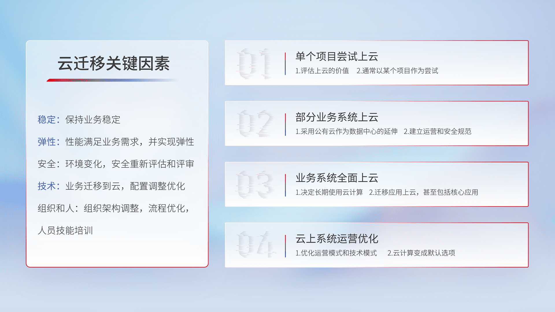 结合实际业务,,从规划设计、、、云平台选型、、云原生改造、、数据迁移、、、集成交付,,,,迁移全过程为客户识别最佳上云路径,,,做好风险识别管理,,,设计网络架构、、身份权限、、、安全审计合规、、、、操作审计、、日志审计、、、监控告警策略、、、、多站点容灾设计等,,,,对云上基础设施进行整体规划,,,,提升IT治理水平,,,,以满足弹性、、、高可用、、、、高性能的需求。。