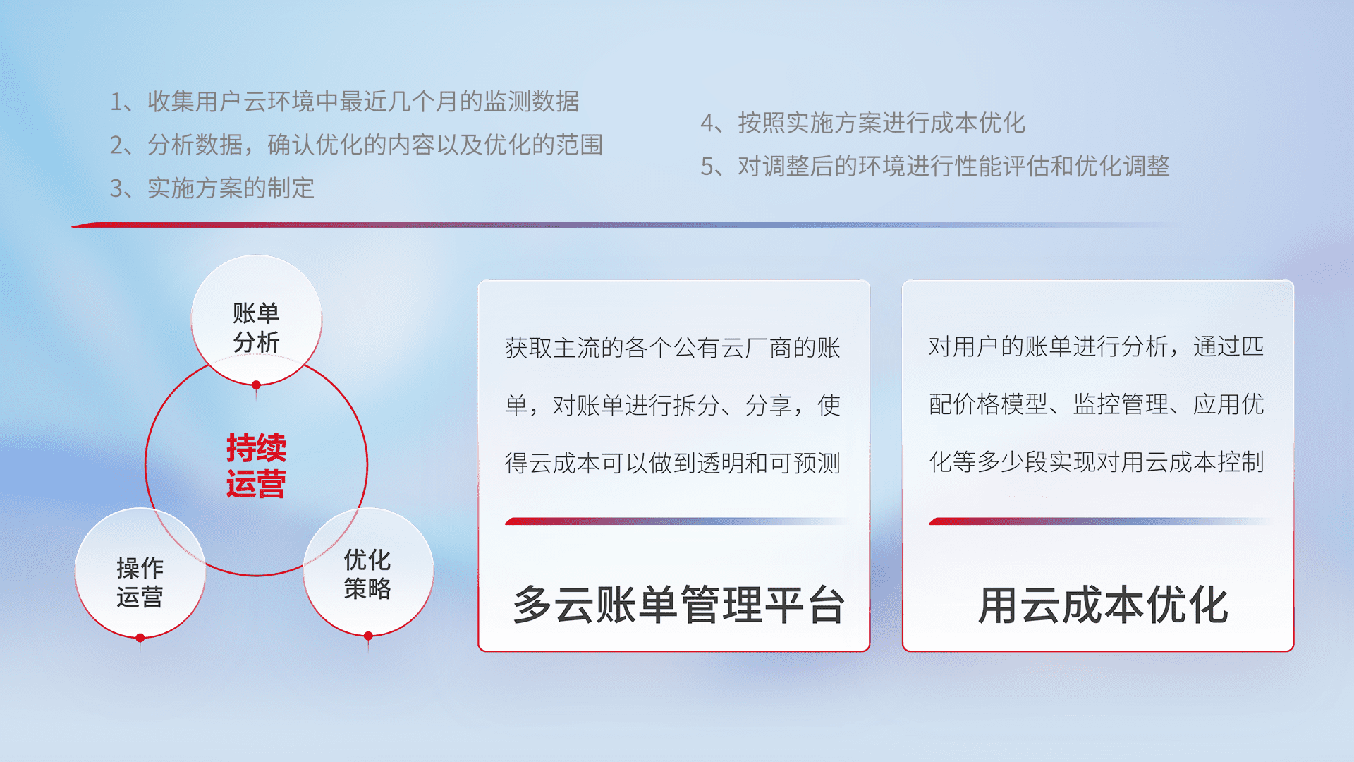 通过多云纳管,,,以统一的资源数据模型把客户的云资源进行抽象和封装,,,,进而实现对多云资源的统一操作,,,保障云资源管理的可靠性、、、稳定性与可用性。。量身定制化运维内容,,,配置、、、、开发运维、、补丁管理、、、备份、、、监控、、认证和访问管理、、、、审计和日常巡检等,,保障在用云过程中的可靠度,,,,稳定度以及高可用率。。